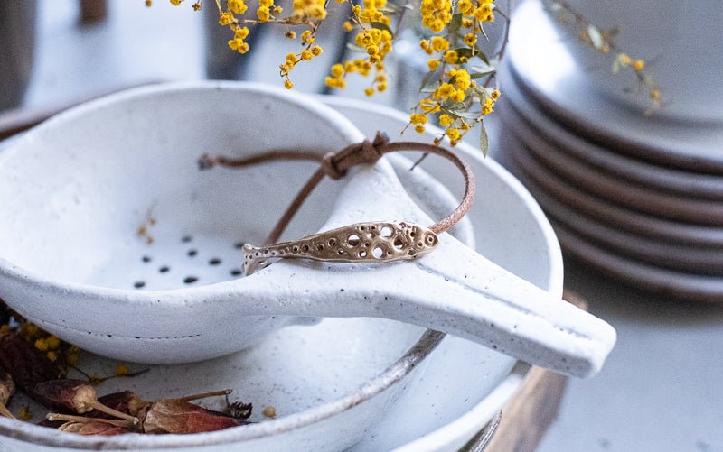 The FINESTRA Bracelet is a striking piece of wearable art, named after the Italian word for “window.” Its organic bronze form is punctuated with irregular openings, evoking tiny windows that let light and air pass through — a symbol of openness, perspective, and possibility.