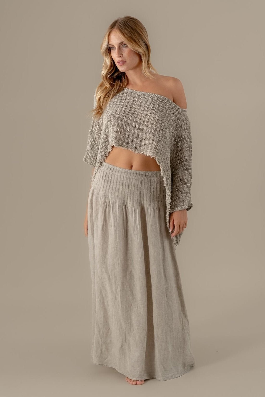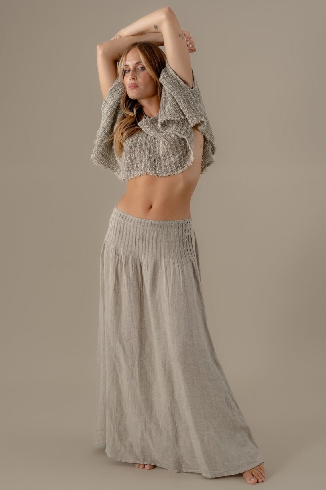 The Gonna Nefertiti is a timeless maxi skirt handwoven in the refined Battista weave. Its fluid drape and artisanal texture highlight Brunella’s dedication to natural beauty and effortless style. Perfect for pairing with both relaxed tops and structured jackets.