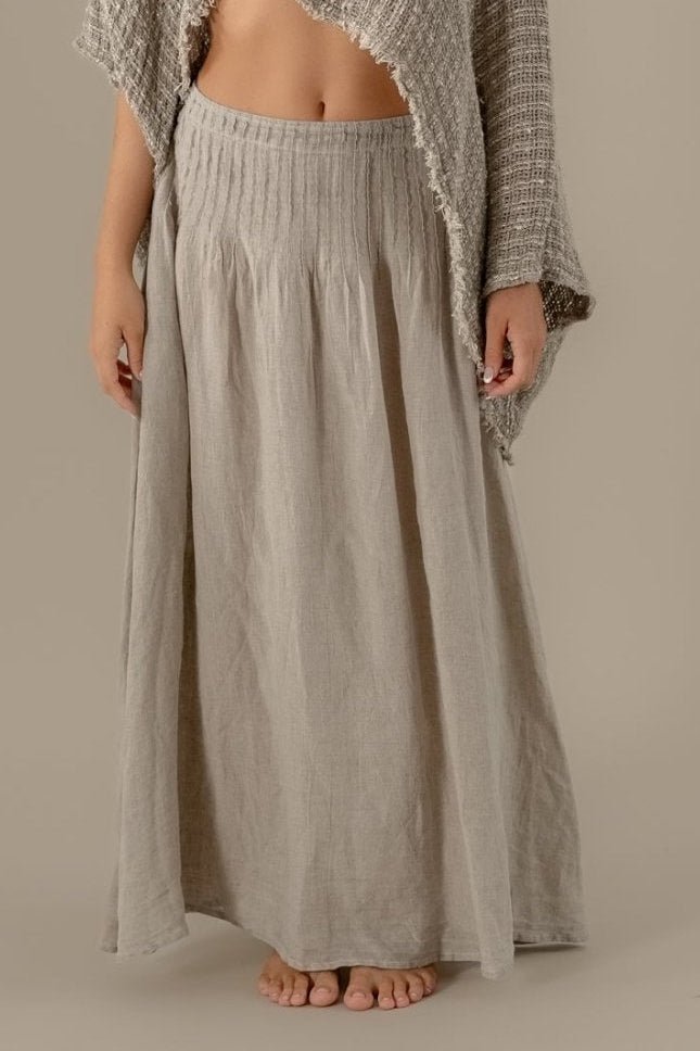 Design details: Elastic waistband, flowing maxi length, artisanal weave