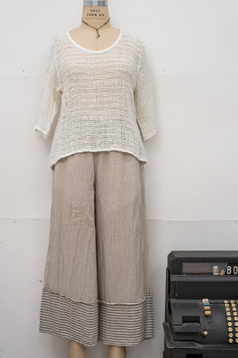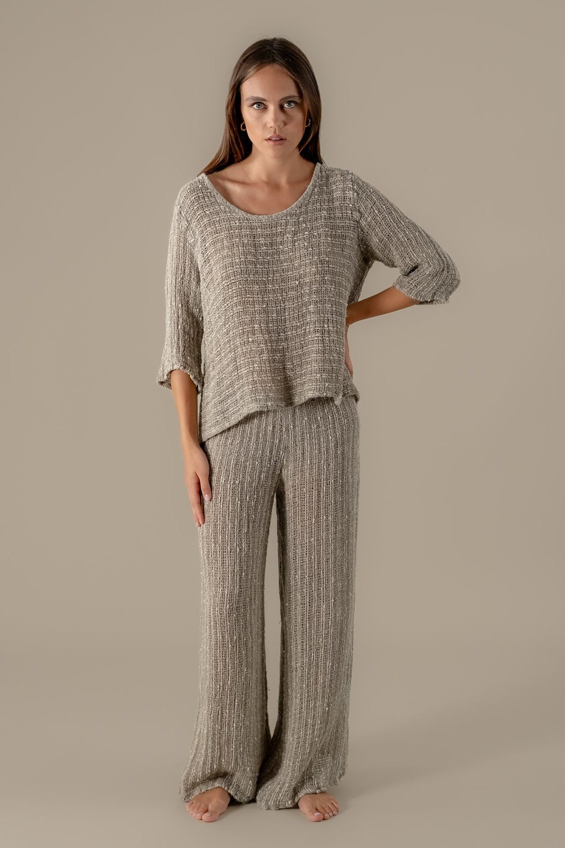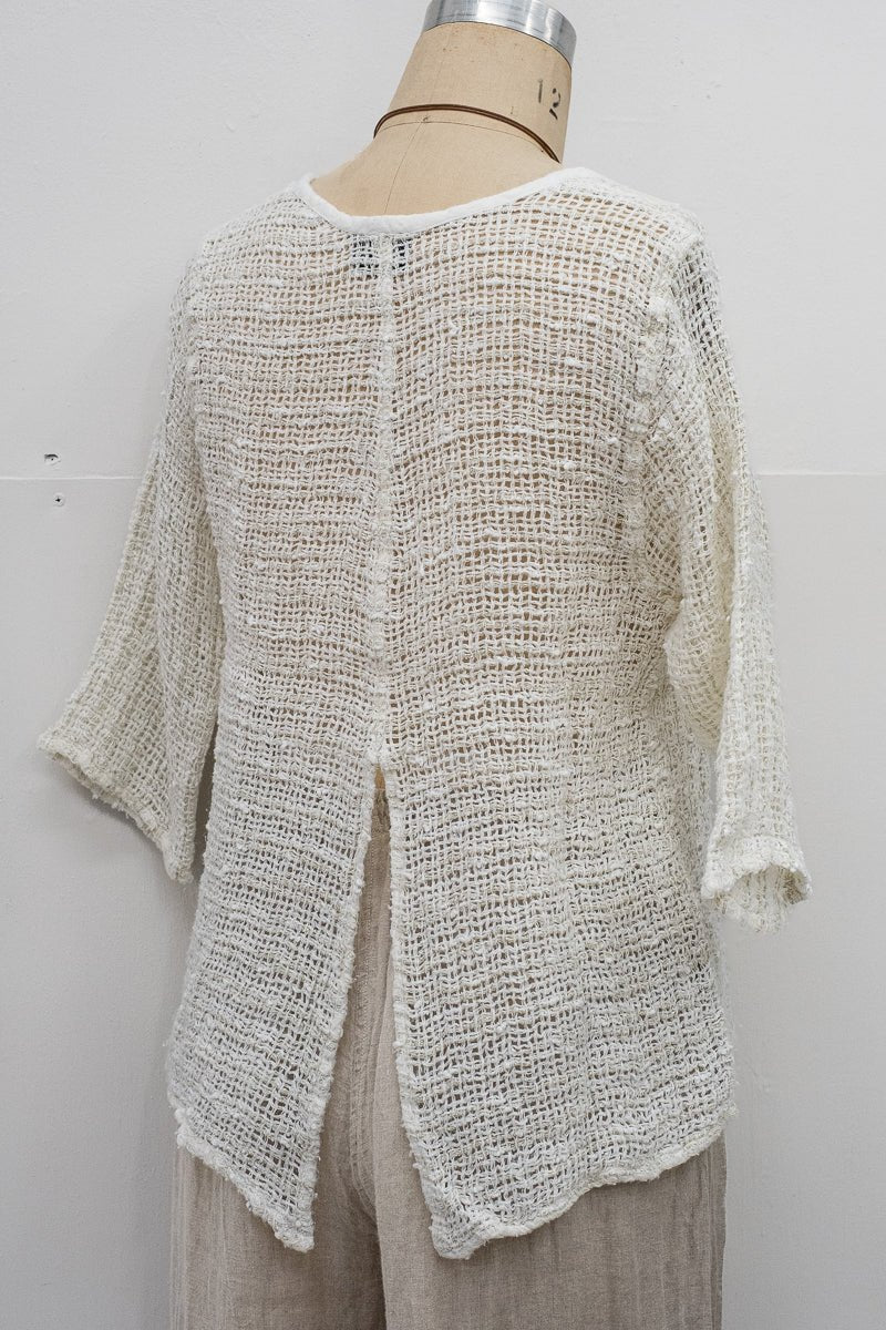 Featuring a relaxed silhouette with a fluid drape, three-quarter sleeves, and side splits for ease, the Maruzzella embodies understated elegance. Its artisanal weave, with subtle tonal variation, makes it a versatile layering piece that elevates everyday wear.