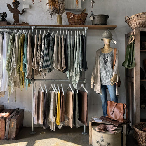 Explore our curated mix of linen clothing, leather bags, handmade jewellery, knitwear, boots & sandals, and homewares.
