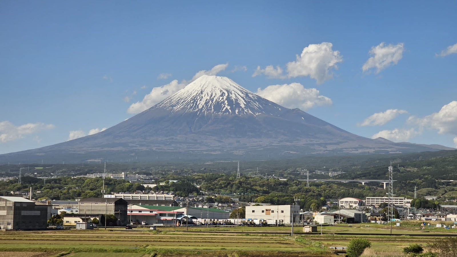Observando la icónica montaña cubierta de nieve aparecer mientras el tren avanza a toda velocidad