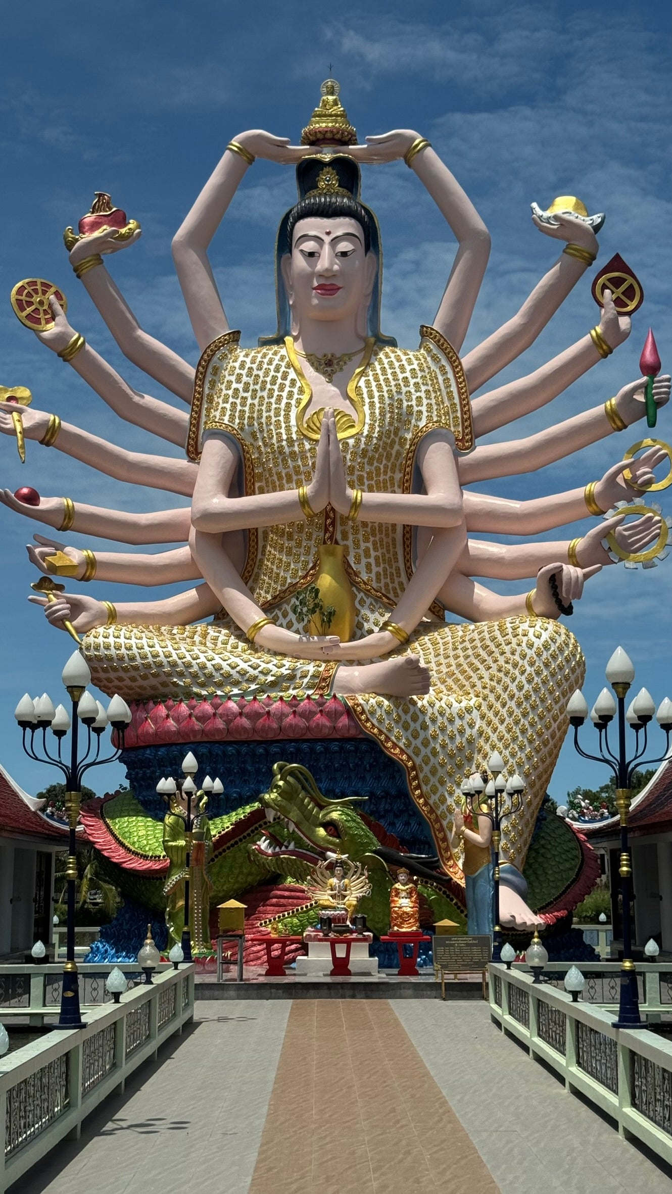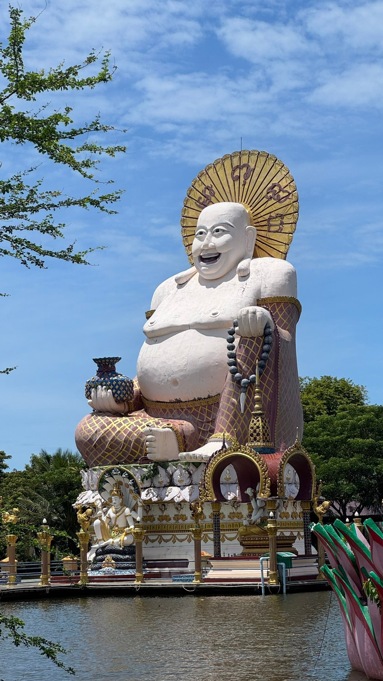 Koh Samui carries a spiritual hum that’s impossible to ignore. It lingers in the air like the scent of incense and moves through the gentle rhythm of daily life. We visited some of the island’s most sacred places - Wat Plai Laem, home to the striking white statue of Guanyin, the goddess of mercy and compassion with her many arms, alongside the joyful Laughing Buddha symbolising happiness and abundance, and the powerful three-headed elephant Erawan representing strength and protection, all set beside a serene lotus pond. We also admired the