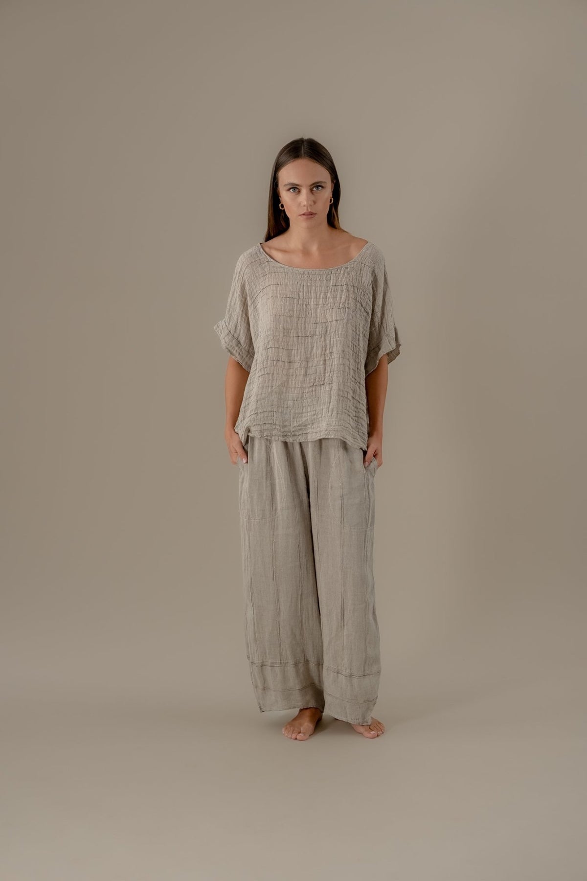 The Camicia Minosse in Garza Egitto from La Bottega di Brunella is an easy, boxy-cut top with a naturally textured finish. Hand-loomed in Positano, its gauzy linen blend fabric drapes softly while allowing breathability and comfort — ideal for warm-weather dressing.