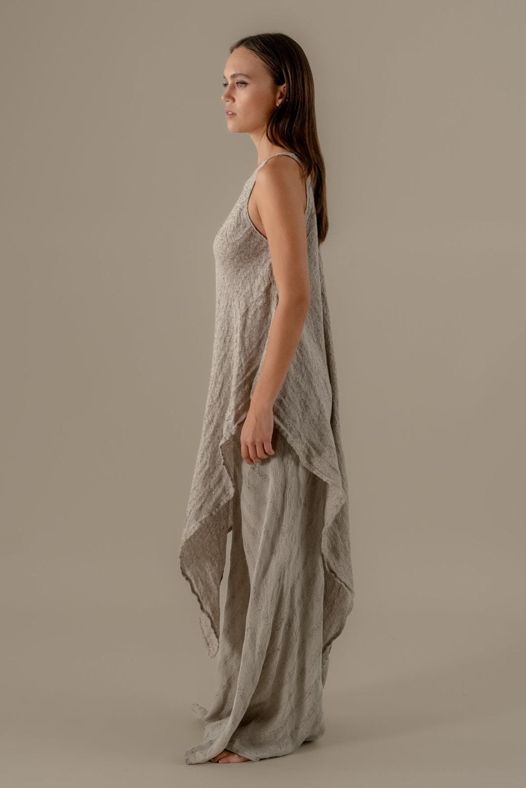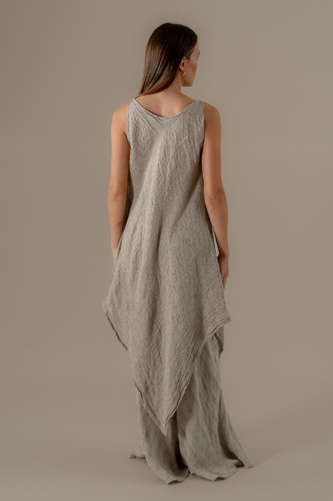 The Canotta Oklahoma in Tela Luxor is an elegant, free-flowing expression of Brunella’s signature handwoven linen. Its asymmetrical cut brings movement and ease, while the subtle lustre of the Luxor weave elevates the simplicity of this sleeveless silhouette.