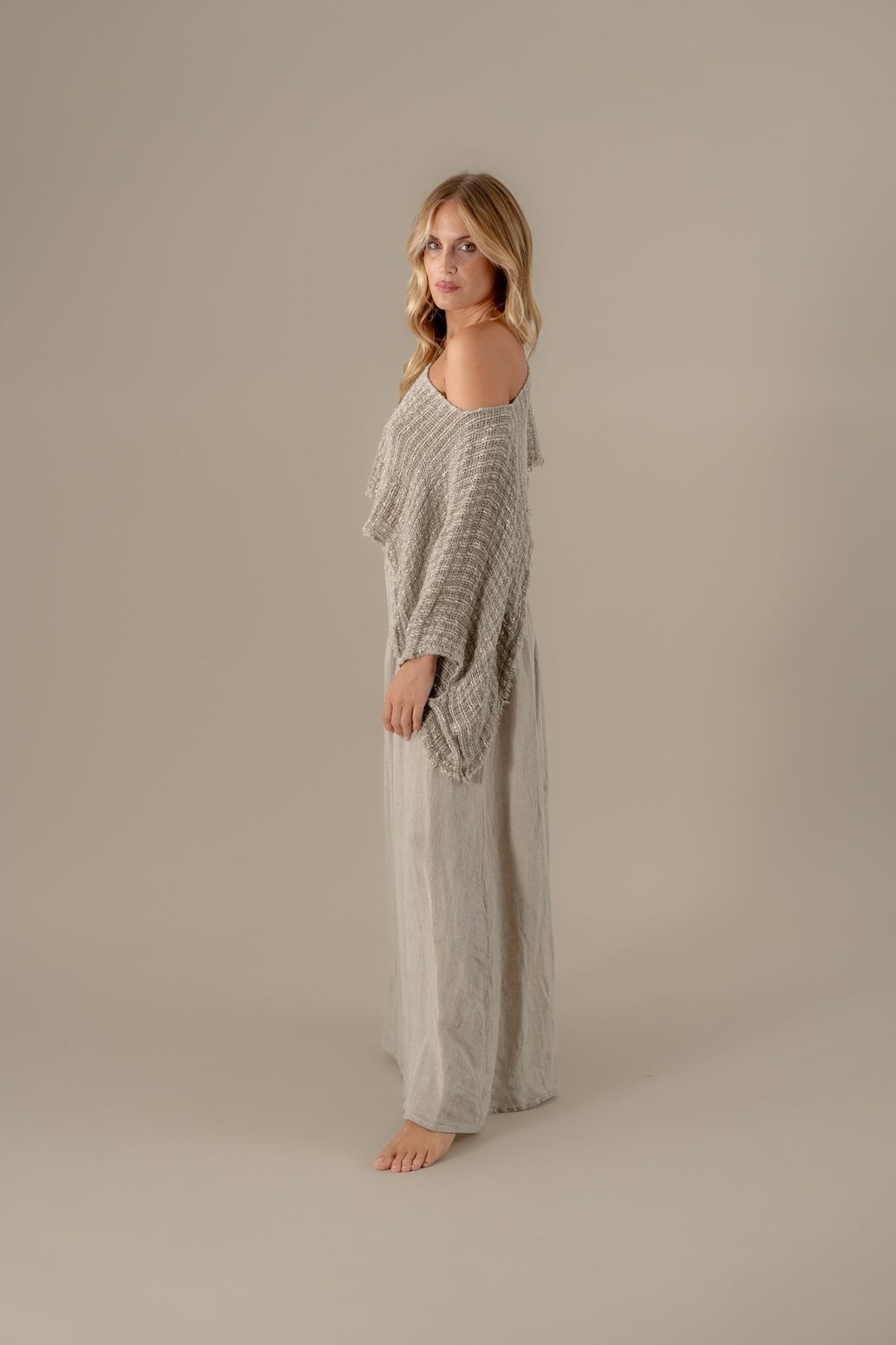 The Maglia Rettangolo is a contemporary knit with a striking asymmetrical cut, designed to drape effortlessly across the body. With its textured weave and raw edge finish, it embodies both comfort and understated elegance.