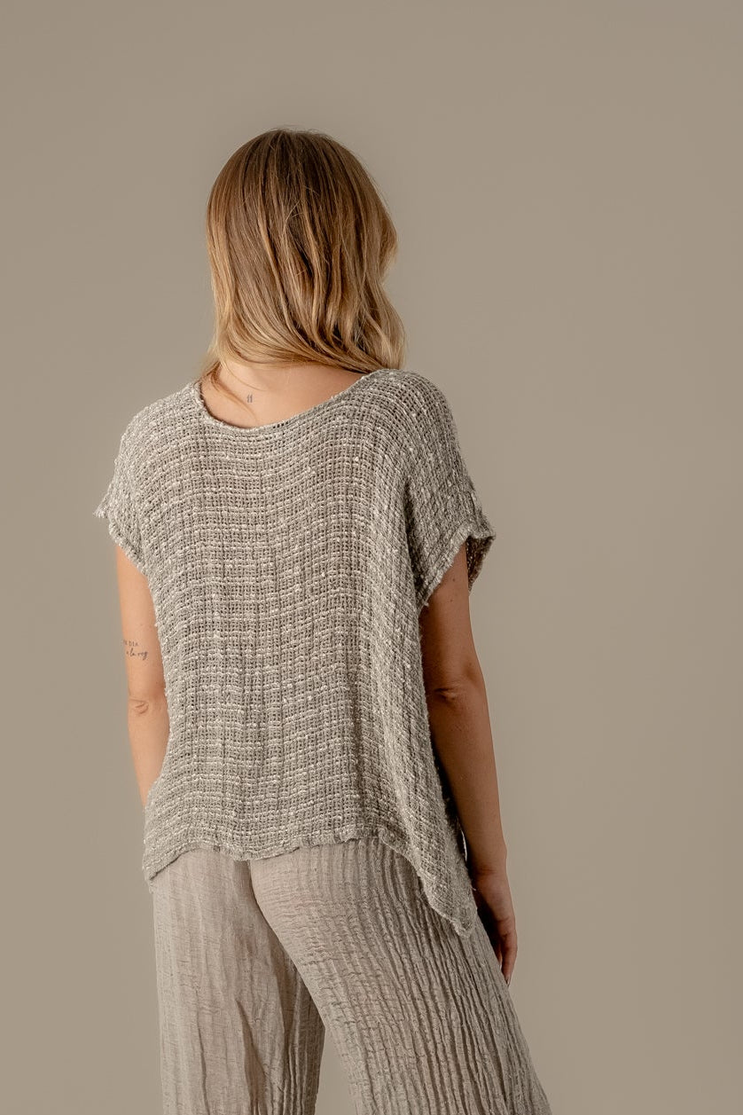 The Top Icaro Più by La Bottega di Brunella is a beautifully textured knit crafted in Campagna Luxor linen. With its raw edges, soft drape, and airy weave, this sleeveless design captures effortless elegance with a touch of rustic charm.