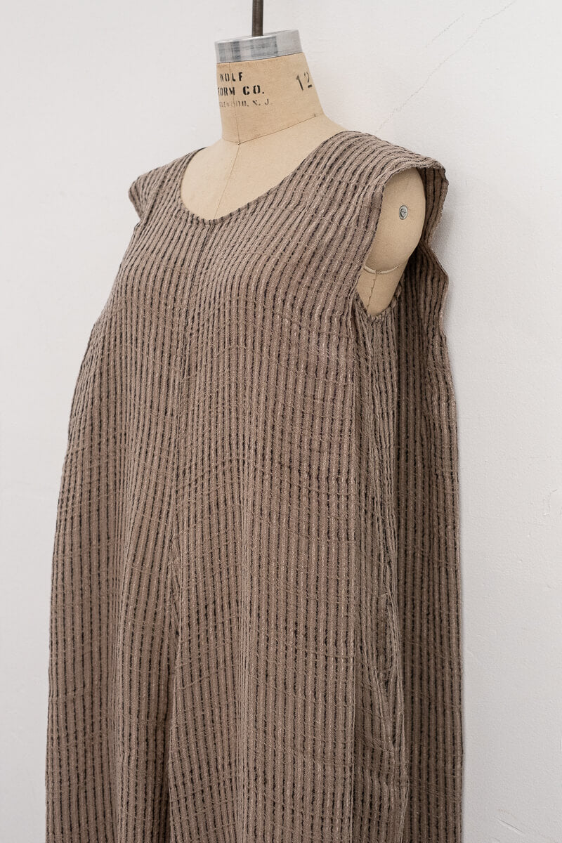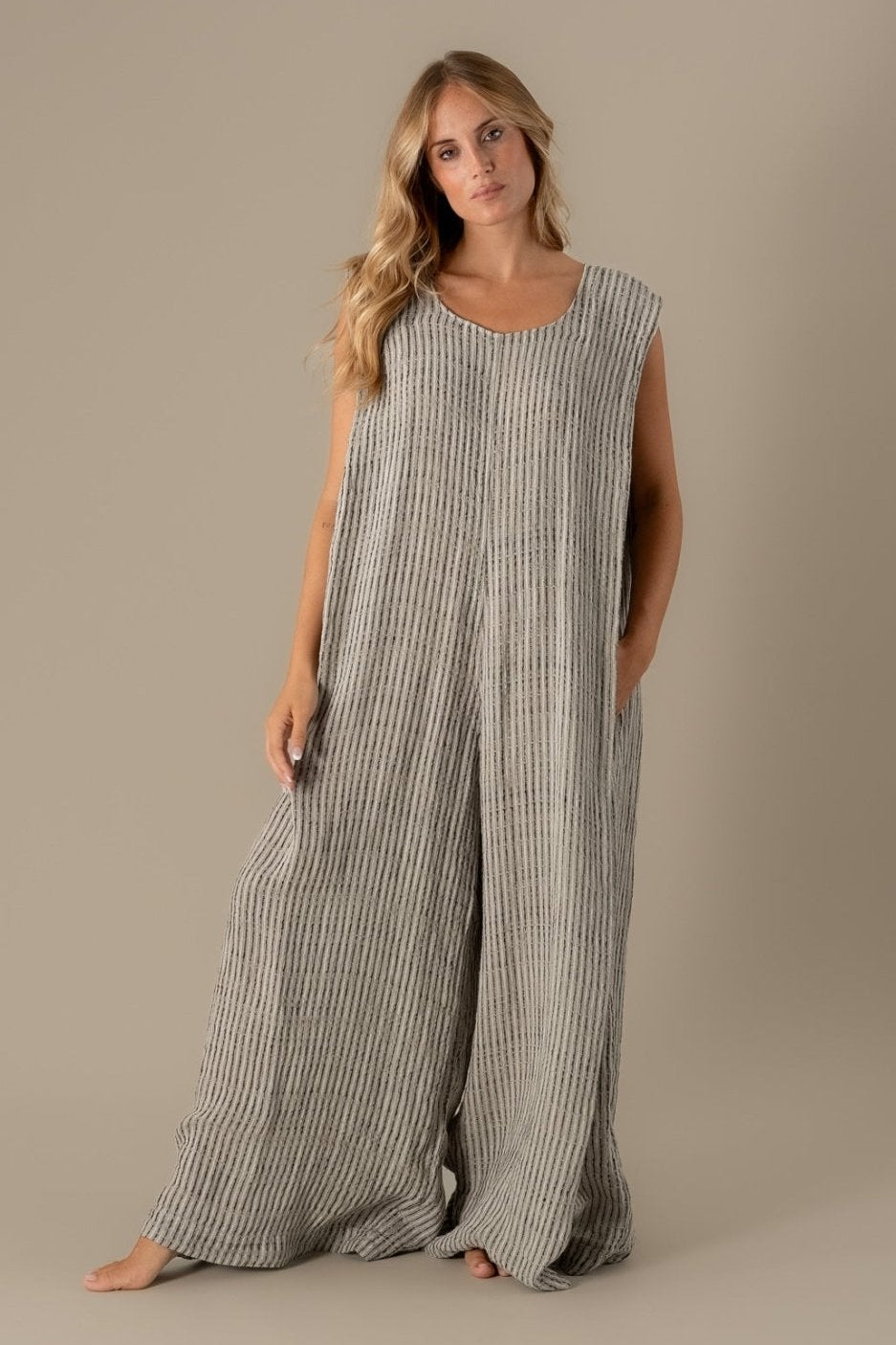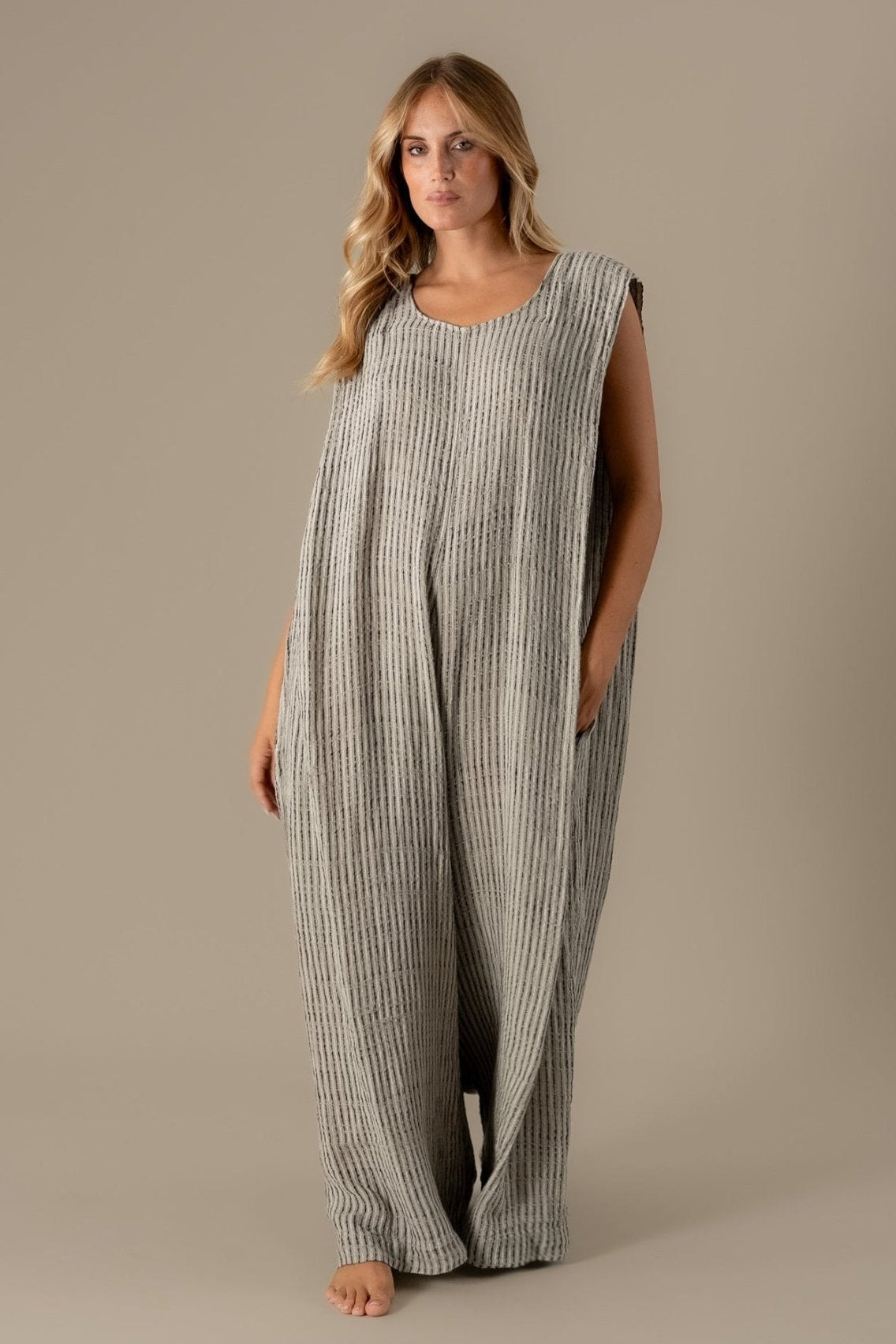 The Tuta Nkhamon in Nilo from La Bottega di Brunella is a sleeveless jumpsuit woven on traditional looms in Positano. Its vertical stripe weave elongates the silhouette, while wide arm openings and a flowing cut create ease and movement.
