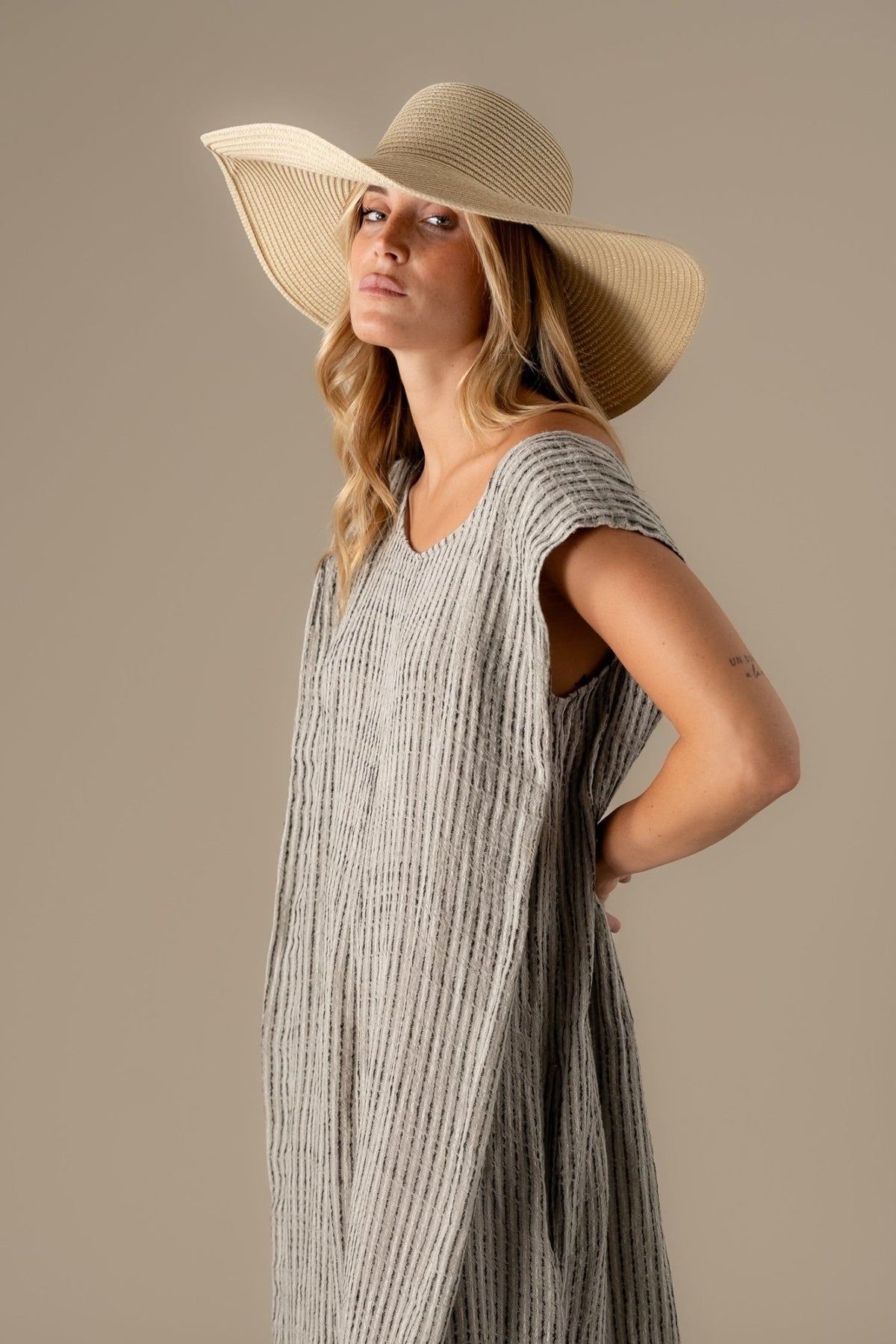 Made in a linen–cotton blend, it balances artisanal structure with lightness, making it an ideal piece for relaxed summer days or coastal evenings. Practical side slits add comfort and versatility, giving this design a modern edge.