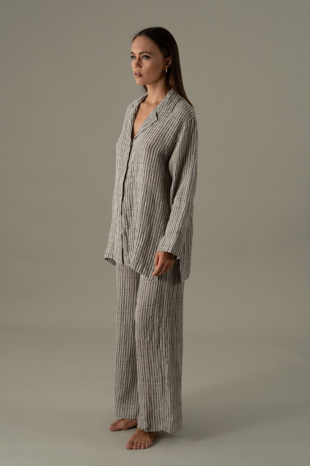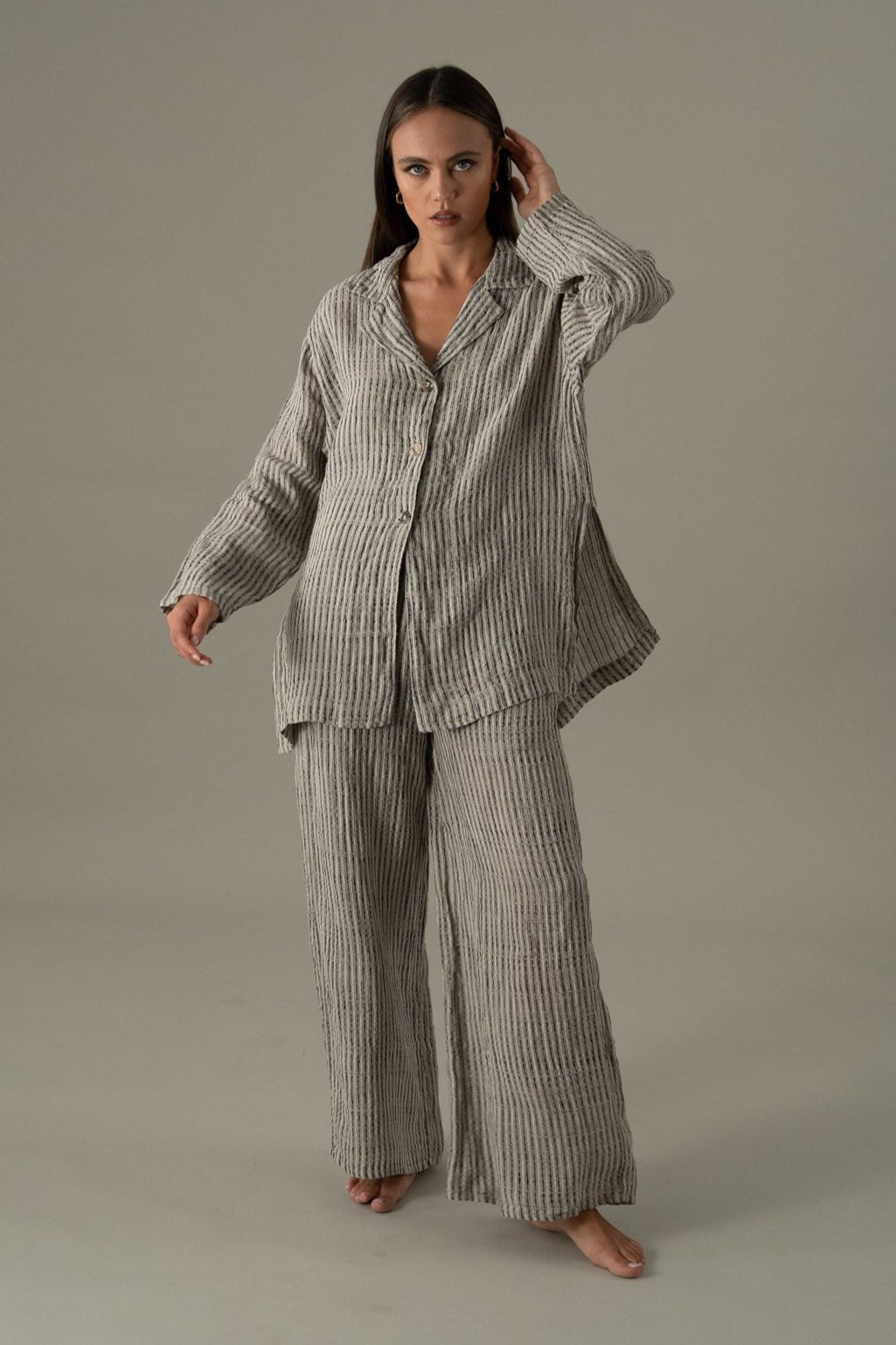 The Pantalone Kebab from La Bottega di Brunella is crafted in Positano on traditional looms, blending timeless tailoring with artisanal texture. Made from the Nilo weave, its subtle striped pattern adds depth and sophistication to the relaxed, wide-leg silhouette.