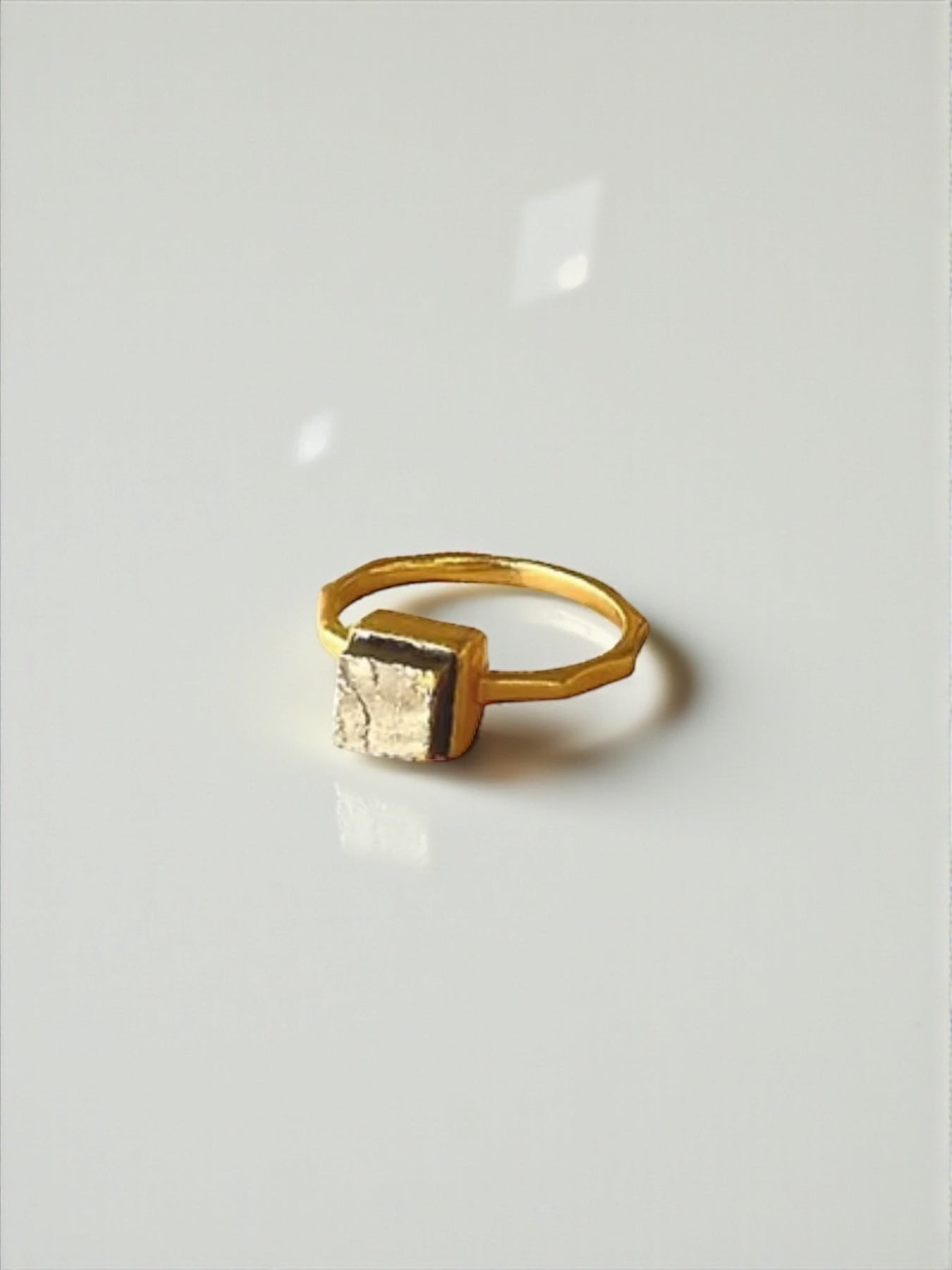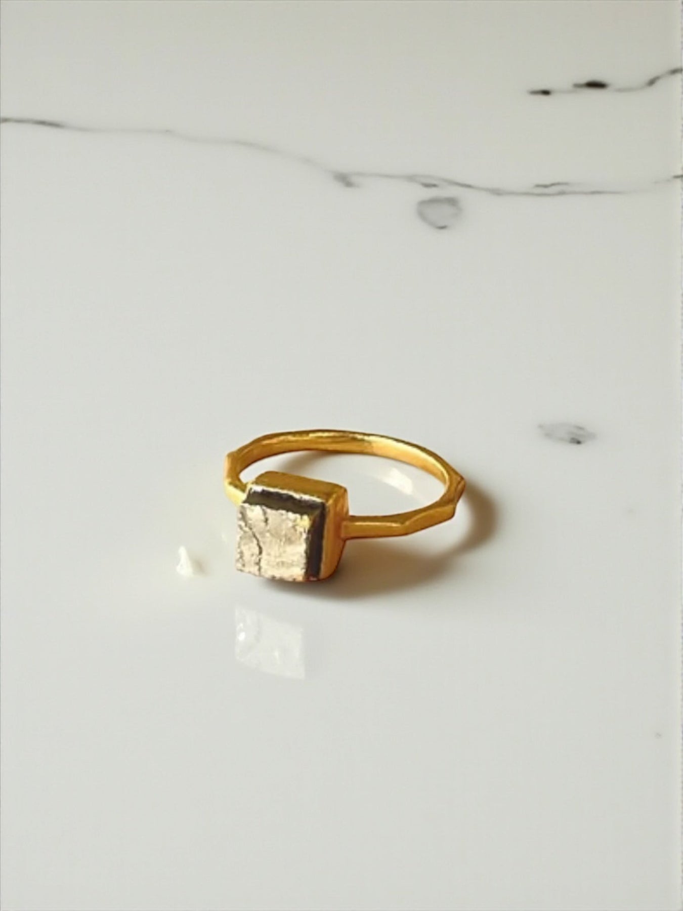 A striking balance of raw texture and refined simplicity. The Ouro Ring features a square-cut pyrite stone set on a slender, gently faceted gold-toned band. Its organic surface catches the light — a small piece with a strong presence.