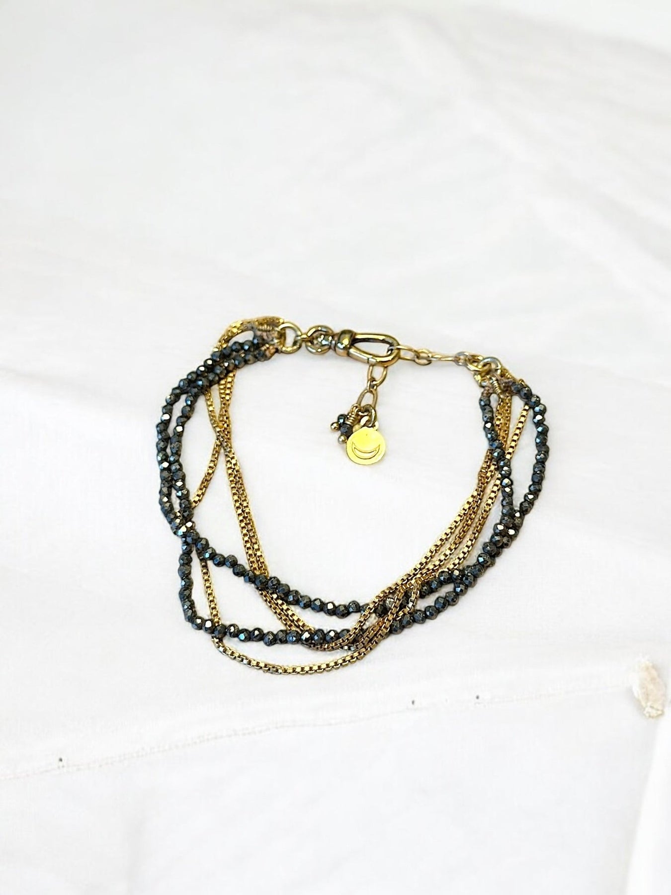The Reya Pyrite Bracelet brings together shimmering pyrite beads and warm gold-toned chains in a beautifully layered design. Light-catching and full of quiet glamour, it sits softly on the wrist and adds effortless depth to any look. A signature Chandra piece—earthy, refined, and easy to wear every day.