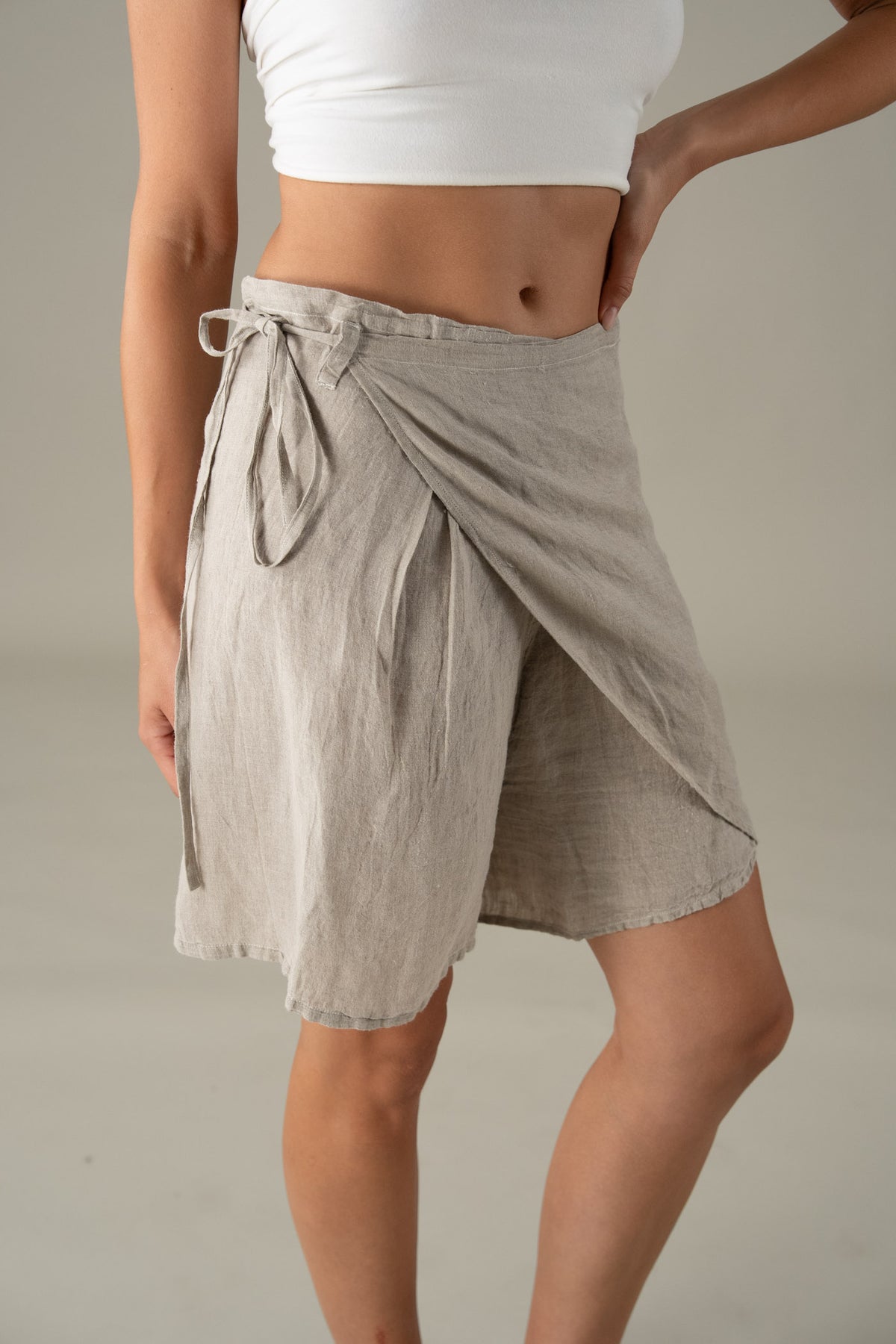 Design details: Overlapping wrap-front style, tie fastening, breathable and soft linen