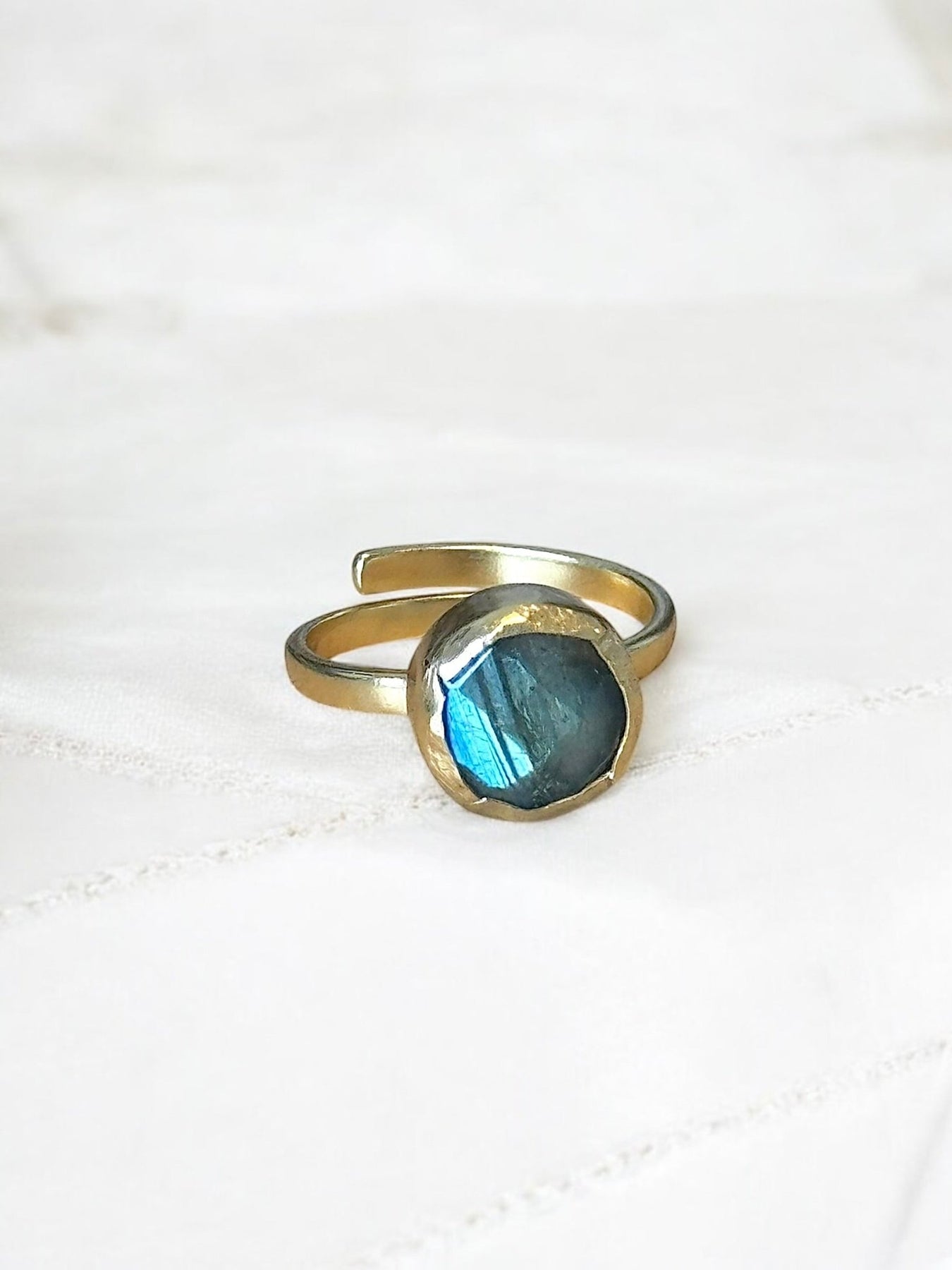 The Stormlight Ring showcases a striking labradorite stone set in a hand-formed brass band. Its natural blue–green flash shifts beautifully with the light, giving the piece an enchanting, elemental feel. A timeless Chandra design—simple, soulful, and full of quiet strength.
