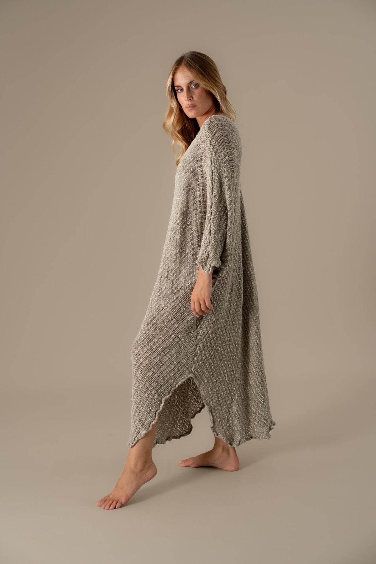 The Vestito Fausta in Camp. Luxor is a relaxed, oversized dress that flows effortlessly with every movement. Its loose silhouette and textured weave highlight the artisanal essence of Brunella’s creations, offering both comfort and understated sophistication.