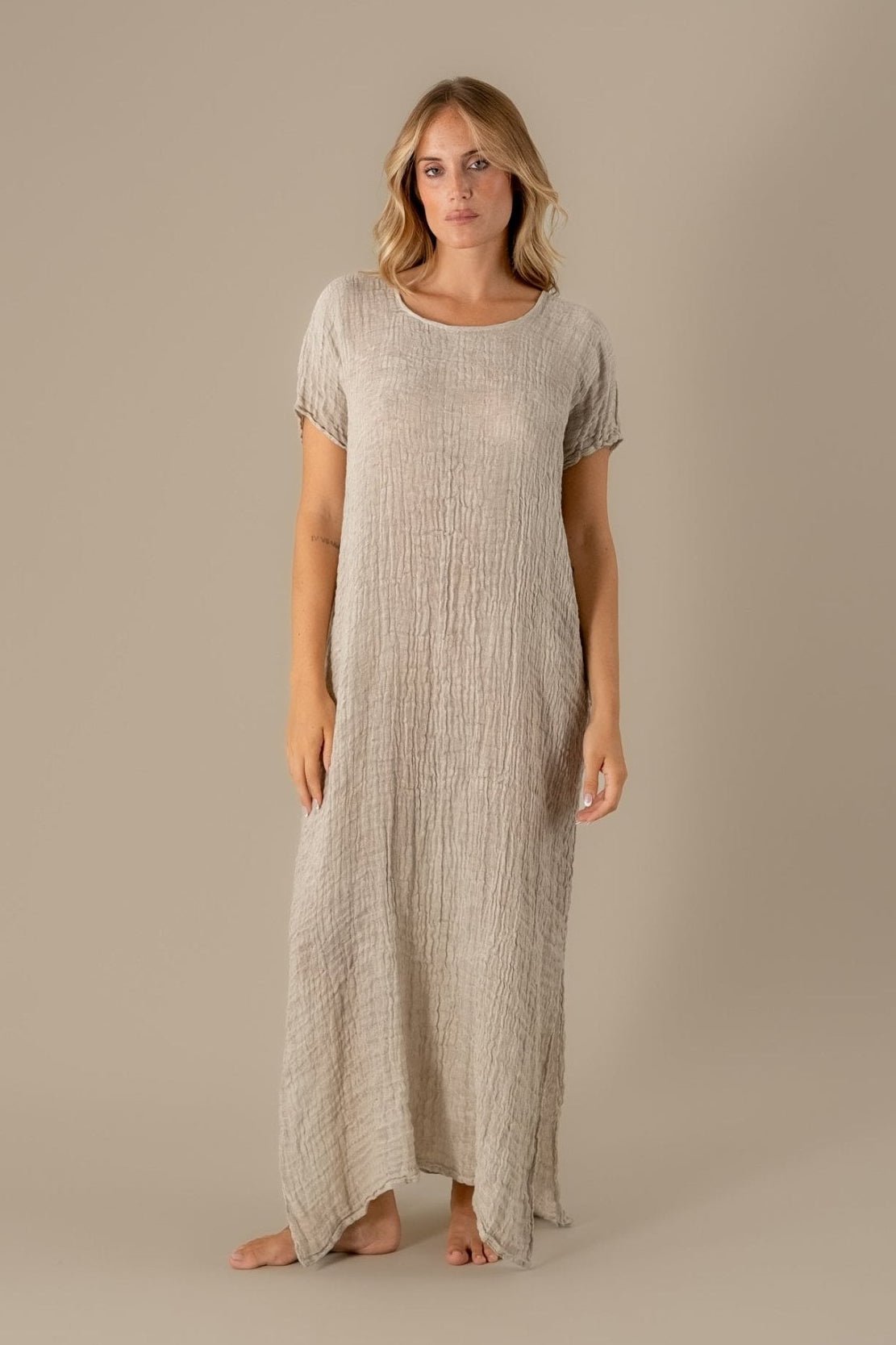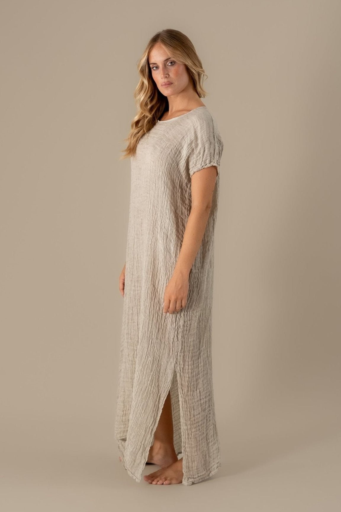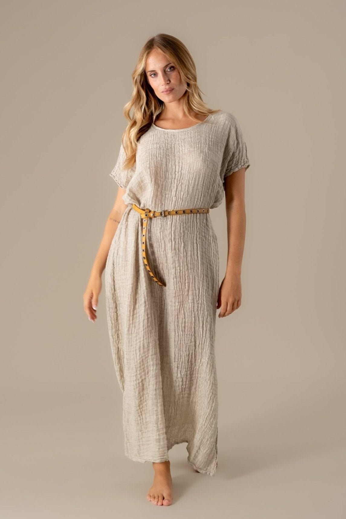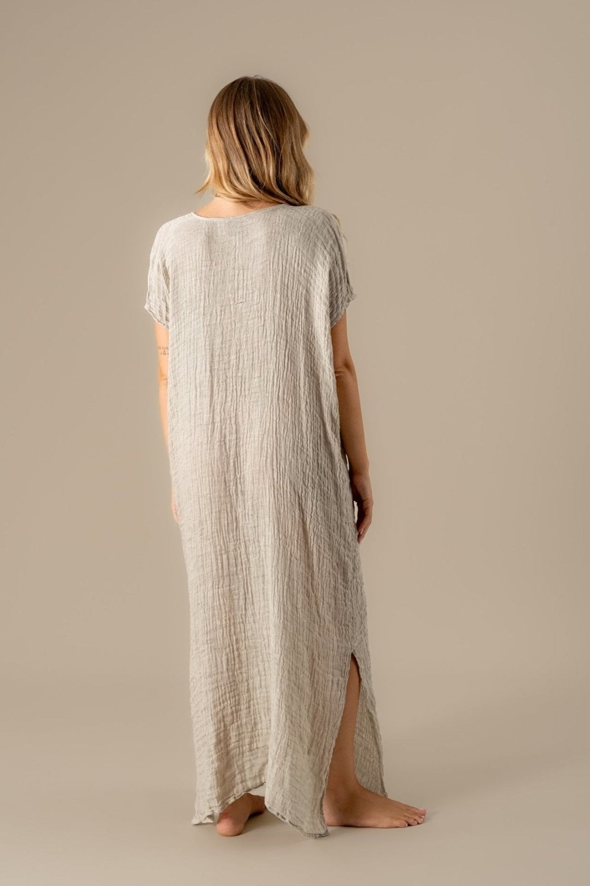The Vestito Icaro in Cairo from La Bottega di Brunella is a relaxed maxi dress designed for everyday ease. Hand-loomed in Positano, its soft linen–cotton blend has a gauzy crinkled texture that drapes naturally, giving the dress a fluid, effortless feel.