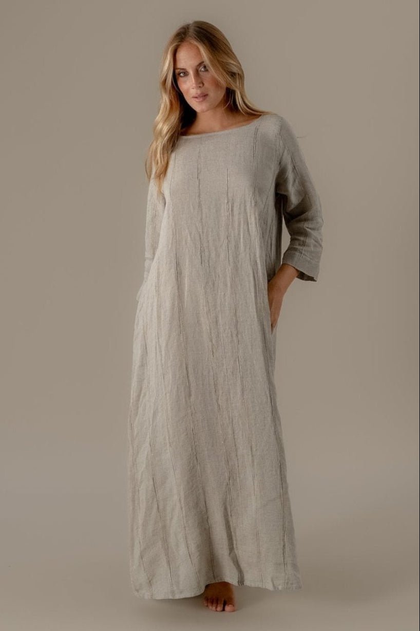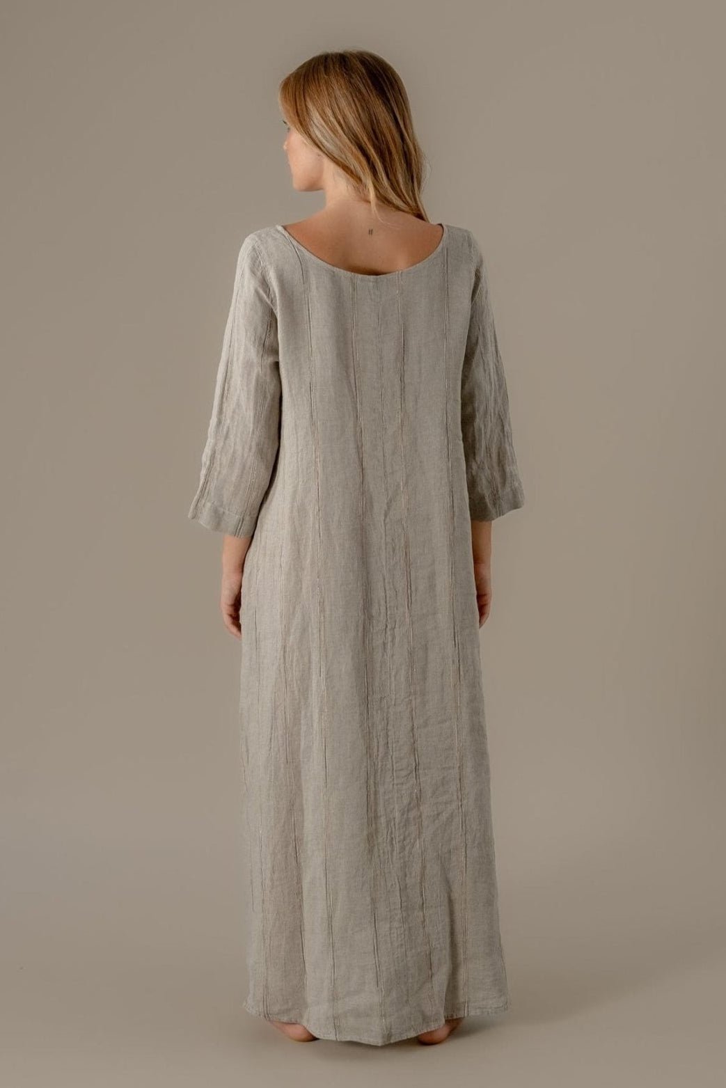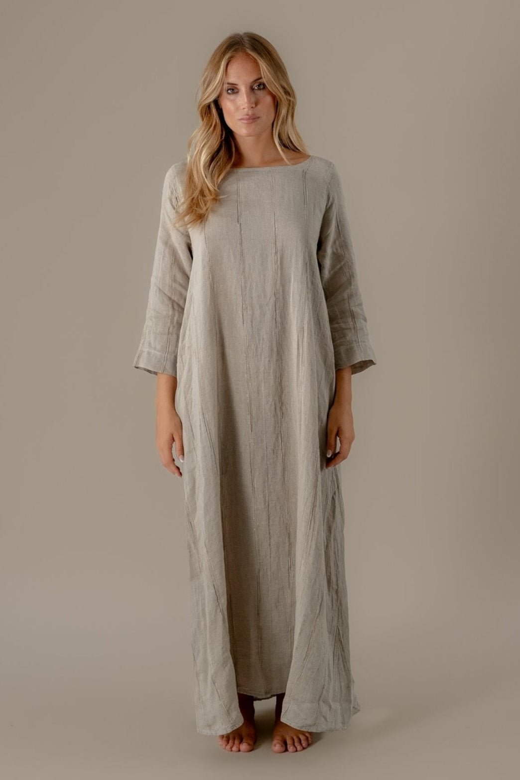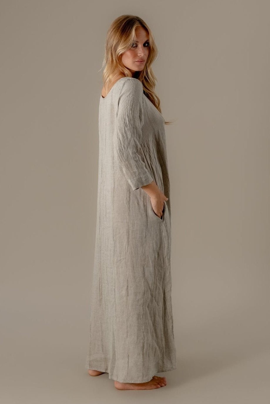 Design details: Wide neckline, 3/4 sleeves, side pockets, flowing ankle-length cut