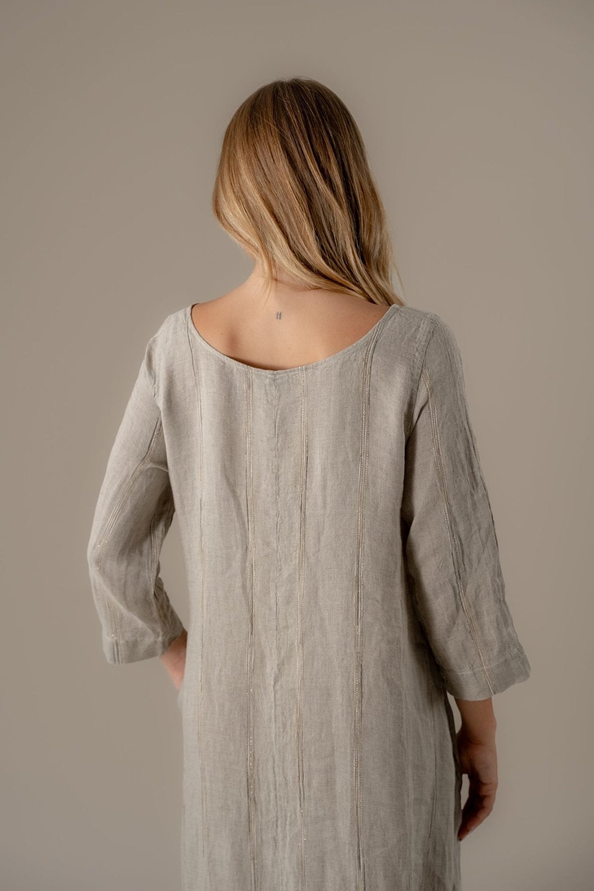 The Vestito Monet in Riga Egitto is a long, relaxed-fit dress with a simple square neckline and soft drape, offering timeless comfort and elegance. Its subtle vertical weave enhances the fluid silhouette, making it an effortless everyday piece with a touch of refinement.