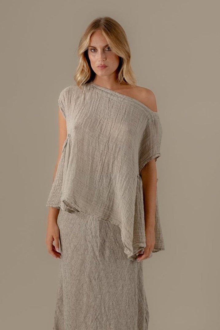 The Top Santafé is crafted from 100% linen in La Bottega di Brunella’s signature garzata weave, offering a soft, airy texture with a slightly sheer finish. Its relaxed drape and asymmetrical neckline create an effortless silhouette, perfect for layering or wearing on its own through warmer seasons.